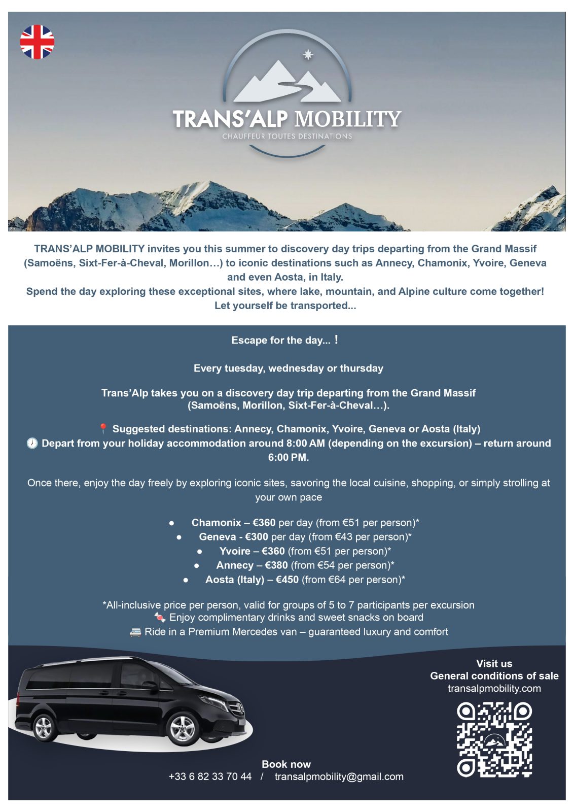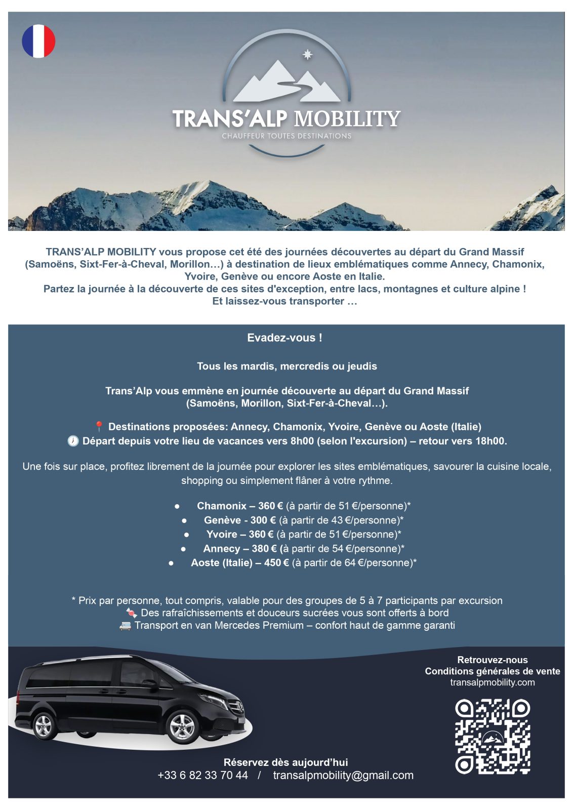 Situé à SAMOËNS et à SAINT-JEOIRE, TRANS’ALP MOBILITY, est votre partenaire de confiance pour tous vos transferts et déplacements en voiture ou van privé (VTC) dans les Alpes françaises, suisses et italiennes. Avec une parfaite connaissance de la région et des véhicules premium, nous vous assurons des déplacements confortables et sécurisés.